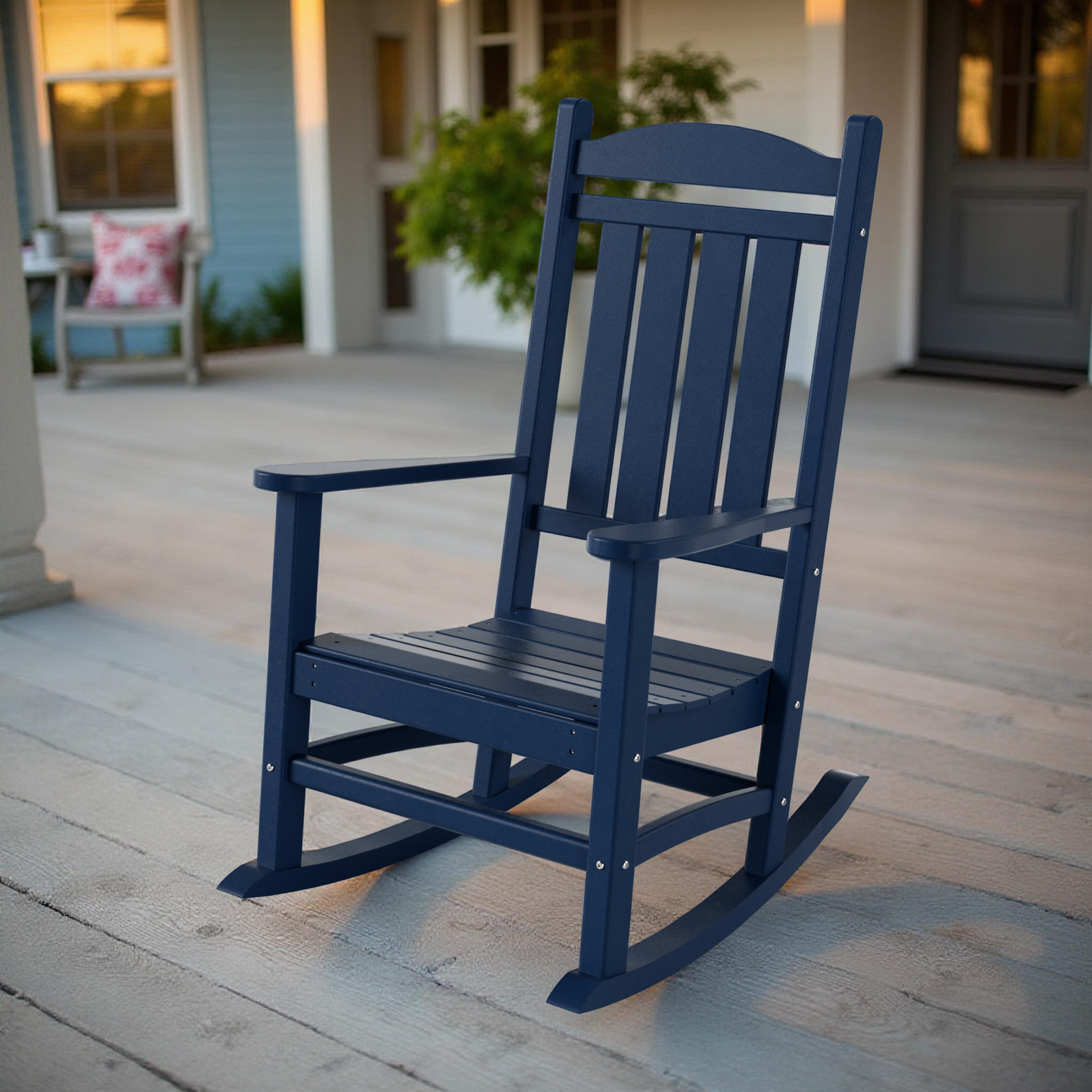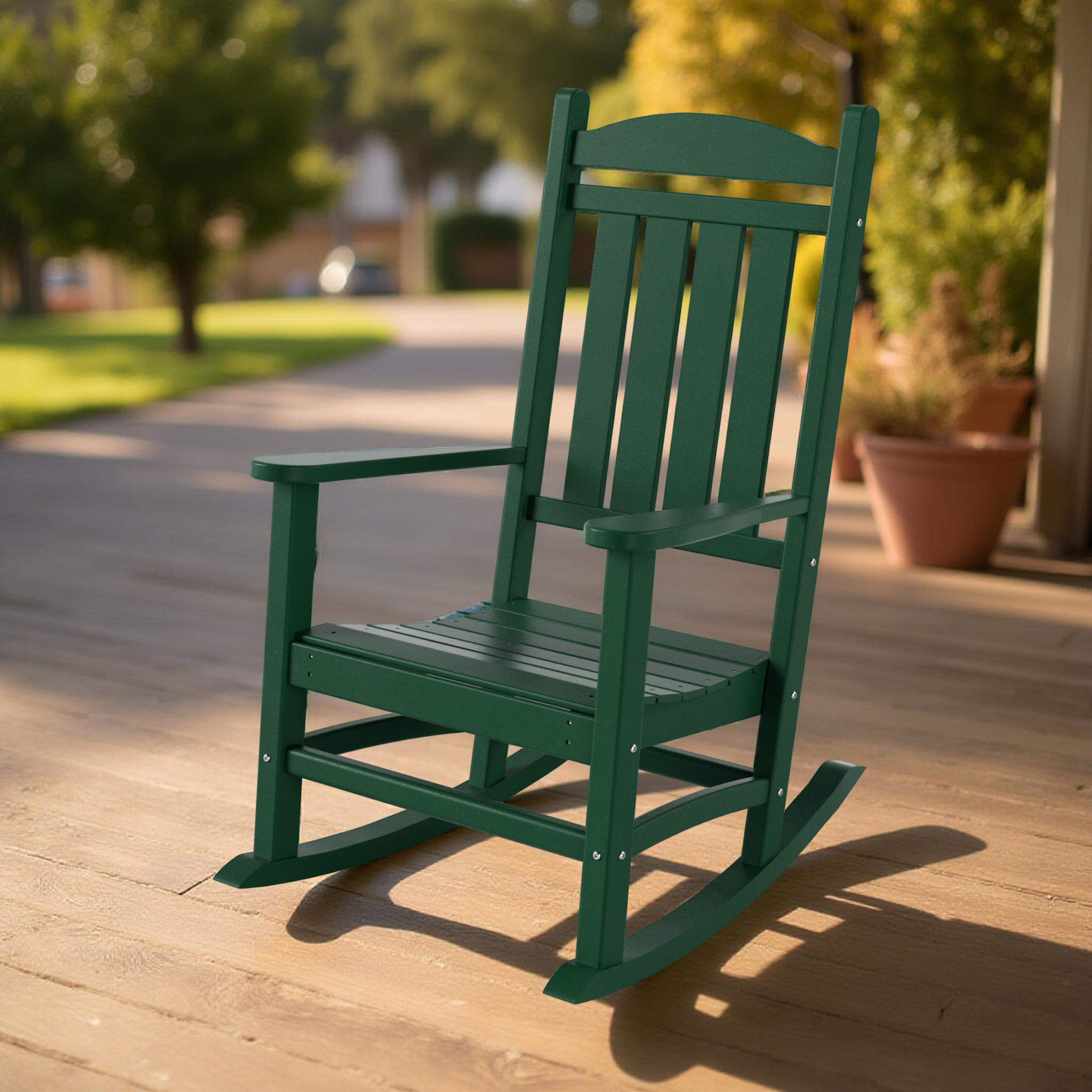 Crafted from premium HDPE lumber, this weather-resistant rocking chair stands up to sun, rain, and snow without cracking, peeling, or fading. Its UV-resistant and water-resistant finish ensures long-lasting beauty and performance, season after season.
